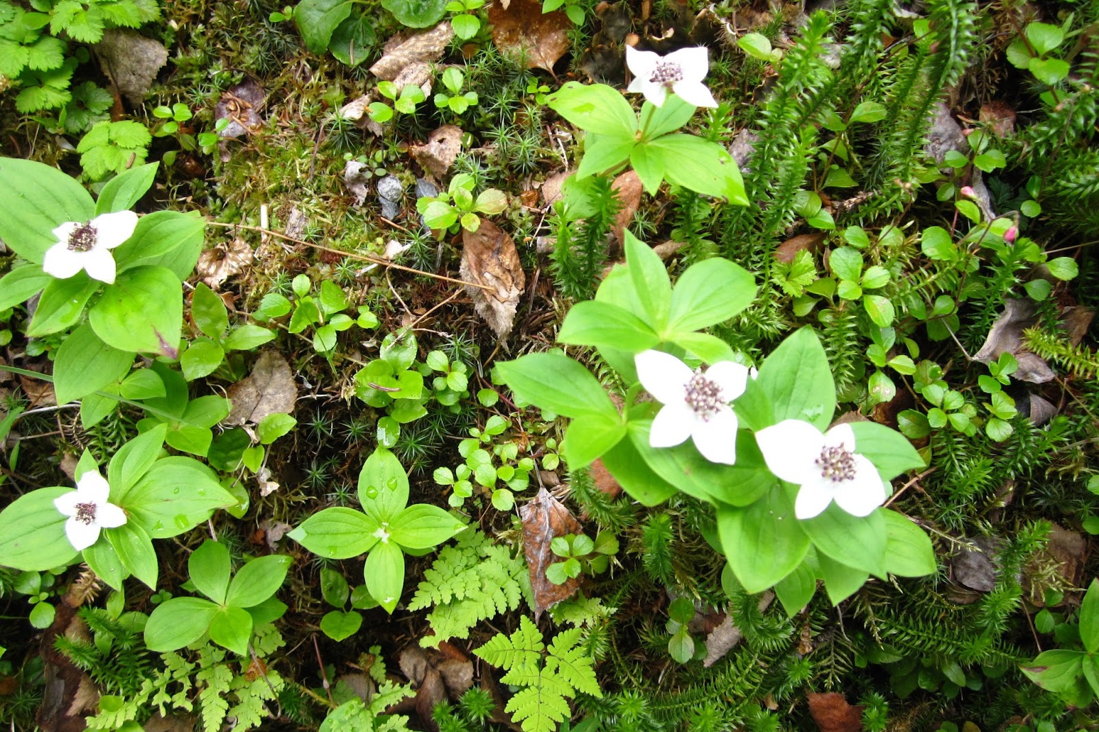 Lovely native white flowered Bunchberry groundcover (Cornus canadensis) was blooming profusely along the trail.